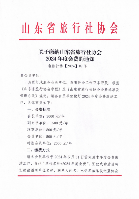 关于缴纳山东省旅行社协会2024年度会费的通知