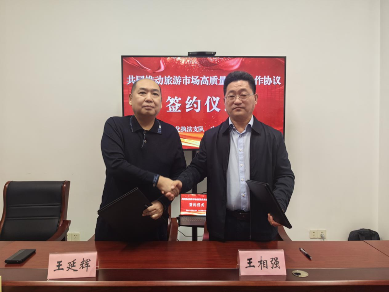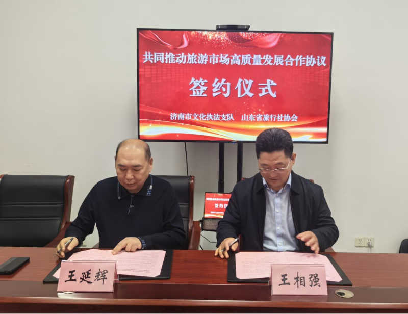 2025年10月30日,济南市文化市场综合行政执法支队(以下简称“市文化执法支队”)与山东省旅行社协会成功举行合作协议签约仪式。市文化执法支队支队长王相强与山东省旅行社协会会长王延辉代表双方签署《共同推动旅游市场高质量发展合作协议》。