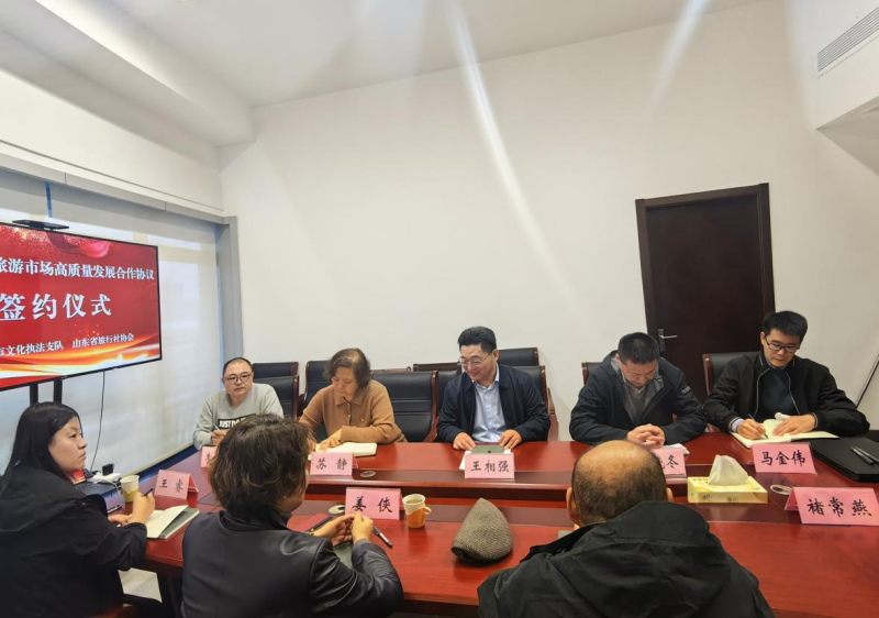 仪式现场,市文化执法支队副支队长王晓冬、综合处处长苏静,山东省旅行社协会秘书长姜侠,以及双方单位相关工作人员共同见证签约。
