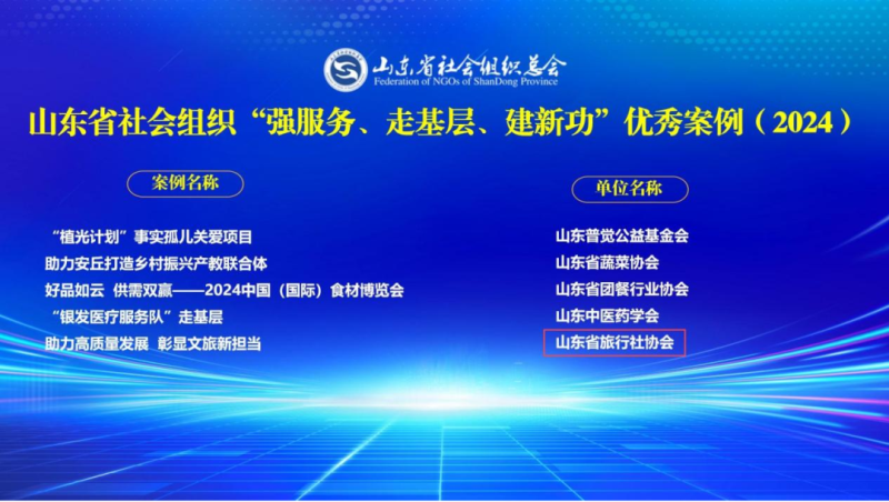 会上分别公布2024山东省社会组织服务高质量发展优秀案例,社会组织“强服务、走基层、建新功”优秀案例名单,山东省旅行社协会提报的《助力高质量发展,彰显文旅新担当》案例入选社会组织“强服务、走基层、建新功”优秀案例名单。